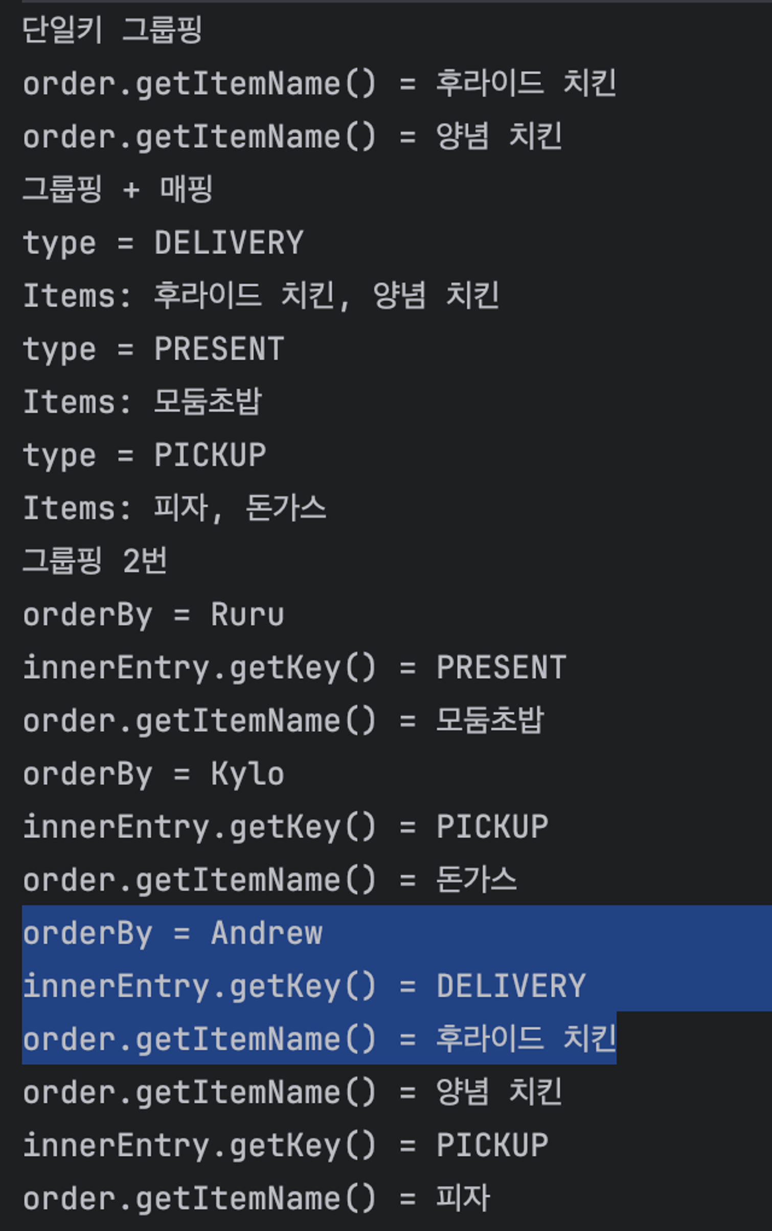 System.out.println("그룹핑 + 매핑");